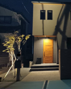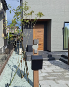 ブラック×木目調の機能門柱、ゆったり幅広アプローチ