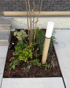 駐車スペース・アプローチ、フェンス、スリット、宅配ボックス、ライト、植栽